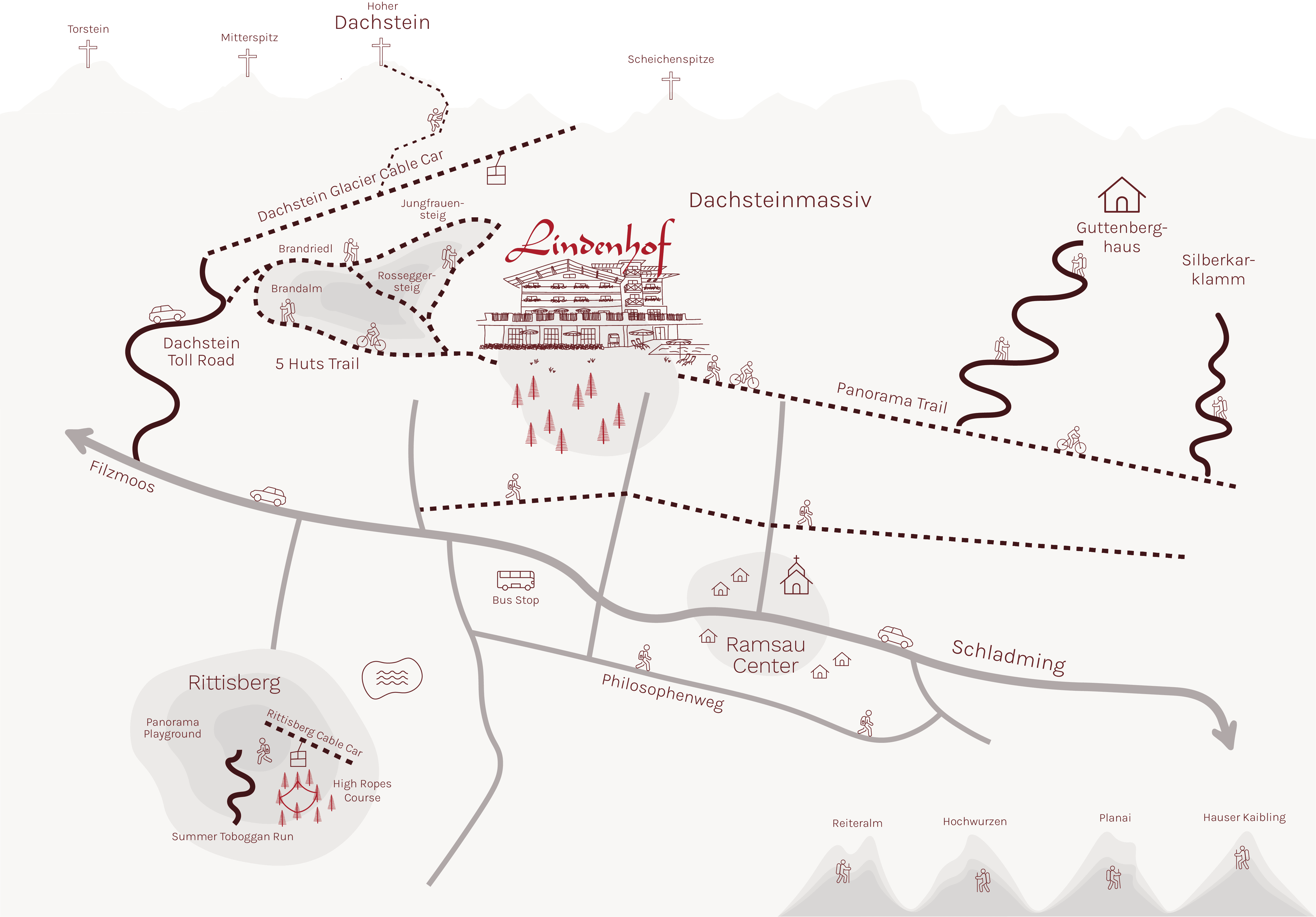 You can get on the Schladming-Dachstein region's public transport network just 500 metres from the hotel. A short drive to Schladming or a sustainable journey to the Dachstein Glacier cable car, you've come to the right place.
